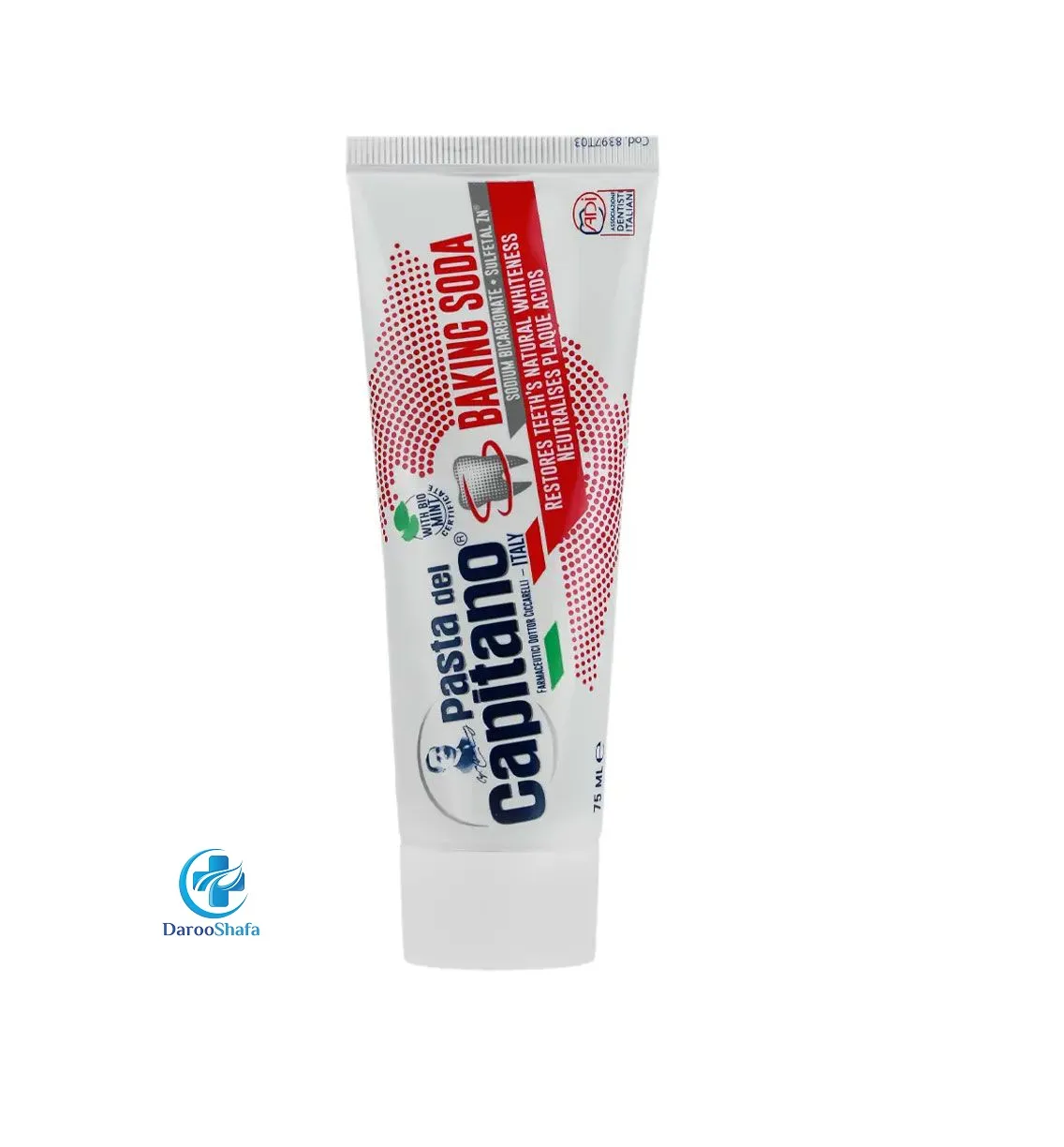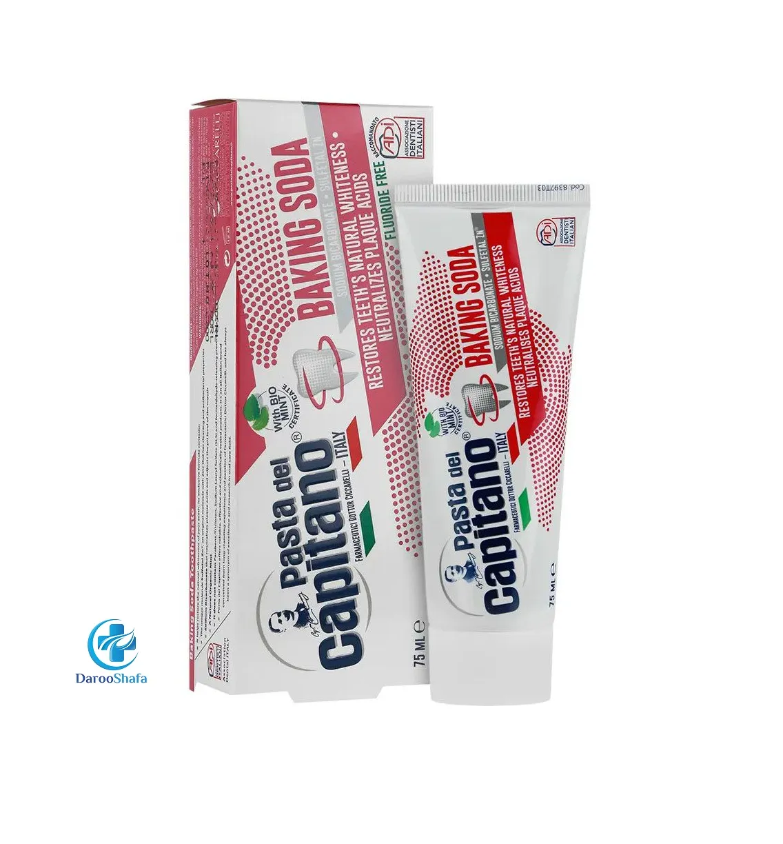 خمیردندان جوش شیرین پاستا دل کاپیتانو ، فاقد فلوراید بوده و حضور بی کربنات سدیم (جوش شیرین) در این خمیردندان ، عمل سفید کنندگی ملایم و حفظ رنگ طبیعی دندان های شما را تضمین می کند. ترکیبات این خمیردندان به خنثی کردن اسیدهای پلاک باکتریایی کمک کرده و همچنین تعادل pH دهان را حفظ می­کنند.