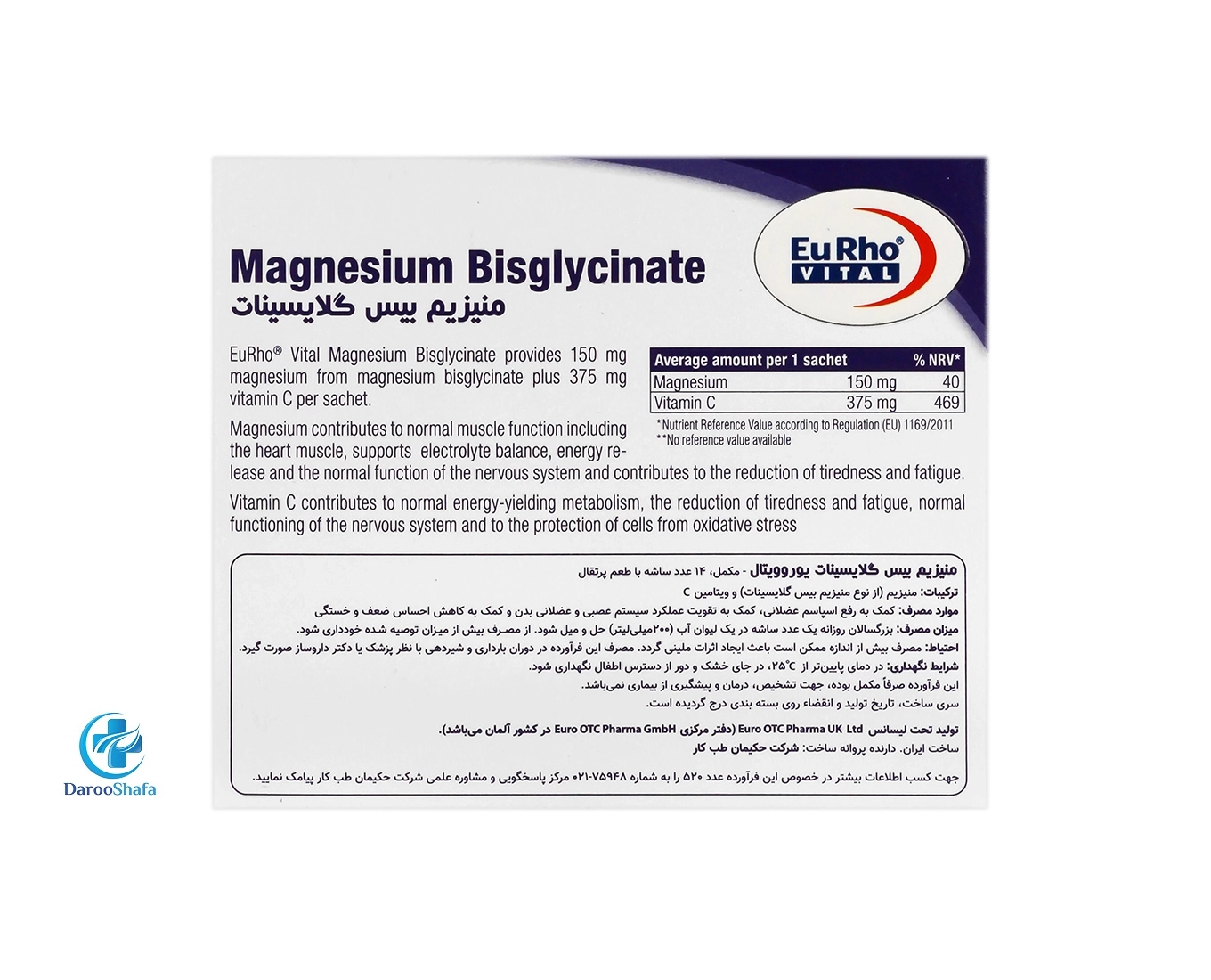 ساشه منیزیم بیس گلایسینات ویتامین سی یوروویتال (بسته ۱۴ عددی) یک مکمل غذایی تحت لیسانس آلمان است که به فرم پودر ساشه‌ ای برای حل شدن در آب طراحی شده و حاوی (۱۵۰ میلی‌گرم) منیزیم به فرم بیس‌ گلایسینات (برای جذب حداکثری) به همراه ویتامین C (۳۷۵ میلی‌ گرم) در هر ساشه می‌ باشد.