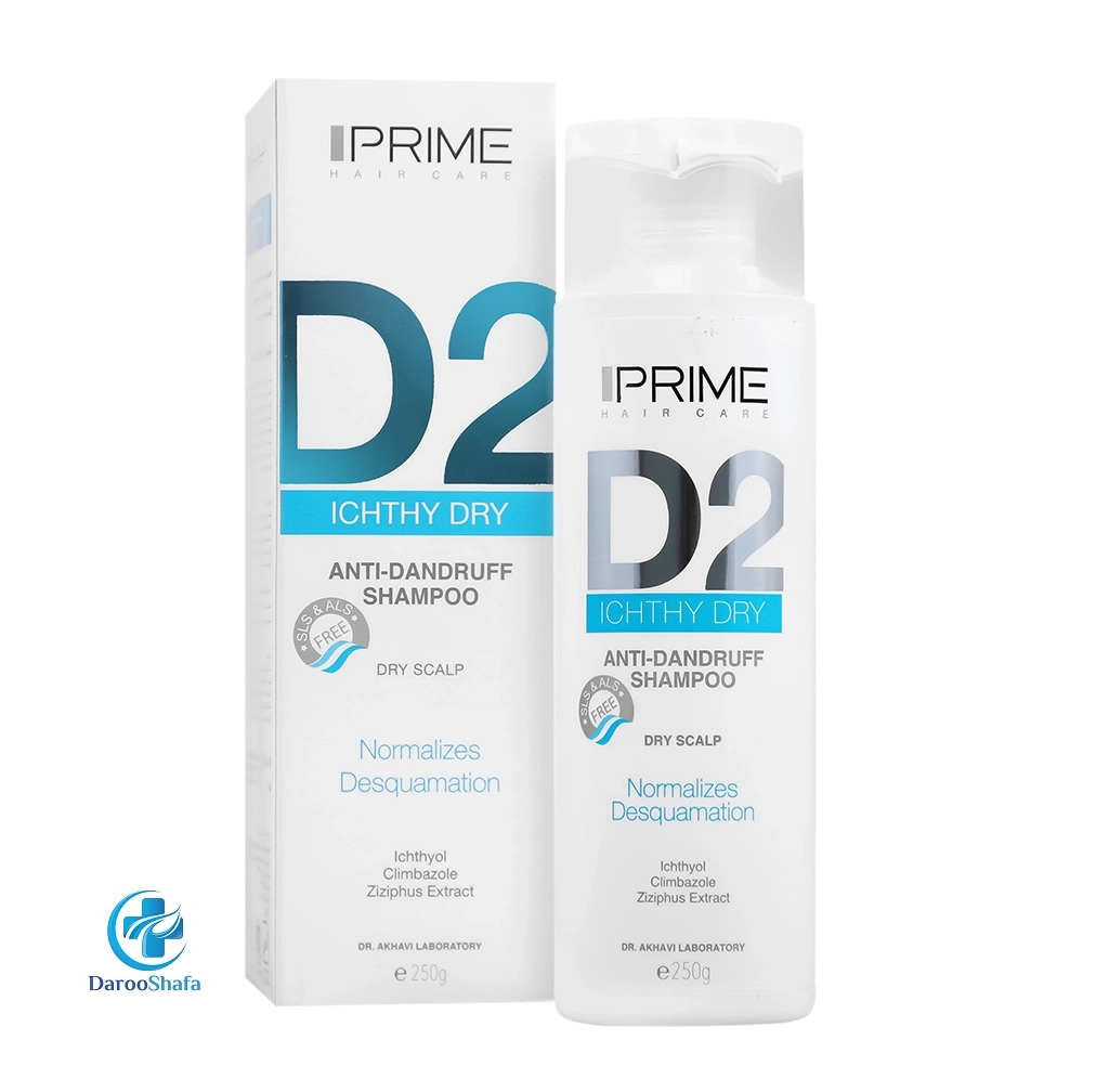 شامپو ضدشوره پوست سر خشک D2 پرایم دارای مواد مؤثر ایکتیول و کلیمبازول است که ضمن رفع هر گونه التهاب و خارش ، با کند کردن سرعت پوسته ریزی ، سبب قطع شوره و نیز مانع رشد و تکثیر قارچ مولد شوره سر می گردند.