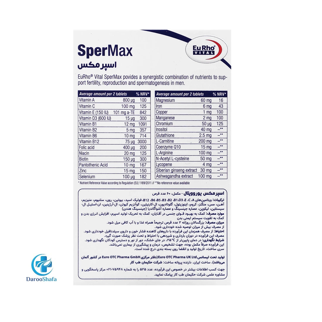 قرص اسپرمکس یوروویتال (EuRho Vital SperMax) ۶۰ عددی یک مکمل غذایی آلمانی (تحت لیسانس) مخصوص آقایان است که برای