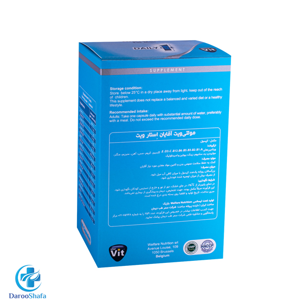 مولتی ویتامین مخصوص آقایان استار ویت، در جعبه های مقوایی ۶۰ عددی حاوی ۴ بلیستر ۱۵ تایی تحت لیسانس Welfare Nutrition بلژیک و توسط سمر طب درمان در ایران تولید می شود.
