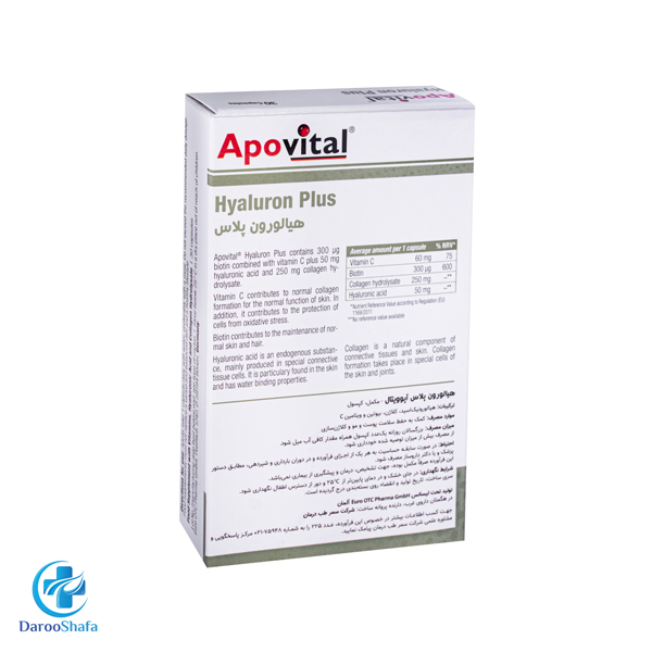 کپسول هیالورون پلاس آپوویتال بسته ۳۰ عددی تحت لیسانس شرکت ایورو او تی سی فارما آلمان تولید