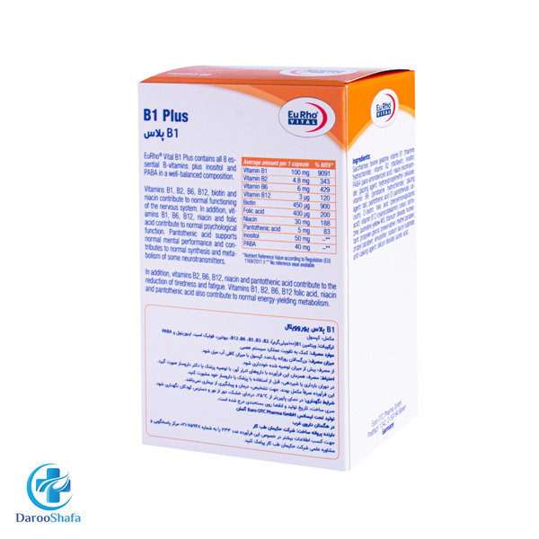 کپسول B1 پلاس برای تمام افراد بزرگسال در معرض کمبود ویتامین B1 و سایر ویتامین های خانواده B، به ویژه افراد سالمند، بیماران دیابتی، افراد مبتلا به سندروم تخمدان پلی کیستیک و تنبلی تخمدان مناسب می باشد. طراحی ویتامین B1 پلاس به فرم کپسول های آهسته رهش کمک می کند جذب ویتامین های موجود در این محصول بهتر صورت گیرد. کپسول ب۱ پلاس یوروویتال تحت لیسانس شرکت آلمانیEuro OTC Pharma GmbH در هگمتان داروی غرب ایران تولید می شود. هر بسته B1 plus حاوی ۶۰ کپسول آهسته رهش می باشد که برای مصرف ۲ ماه هر فرد کافی می باشد.