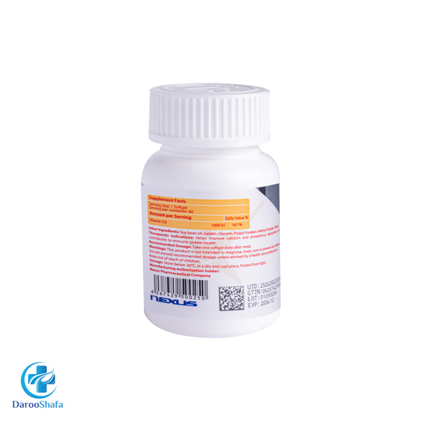 • مکمل تغذیه‌ای دارای 25 میکروگرم ویتامین D به ازای هر سافت ژل